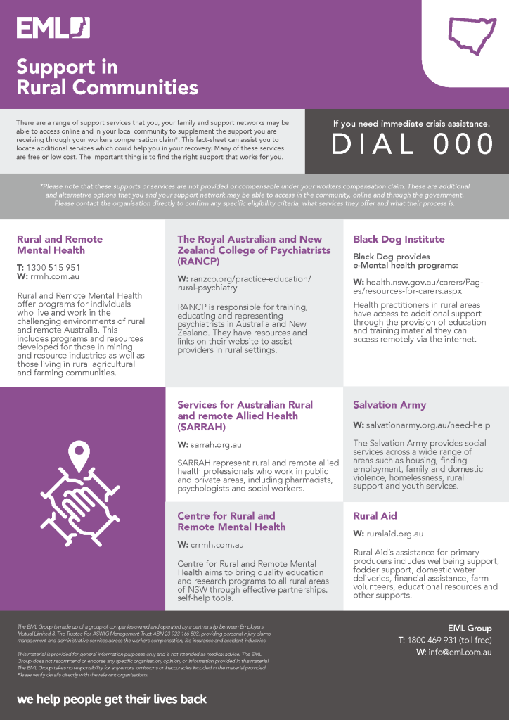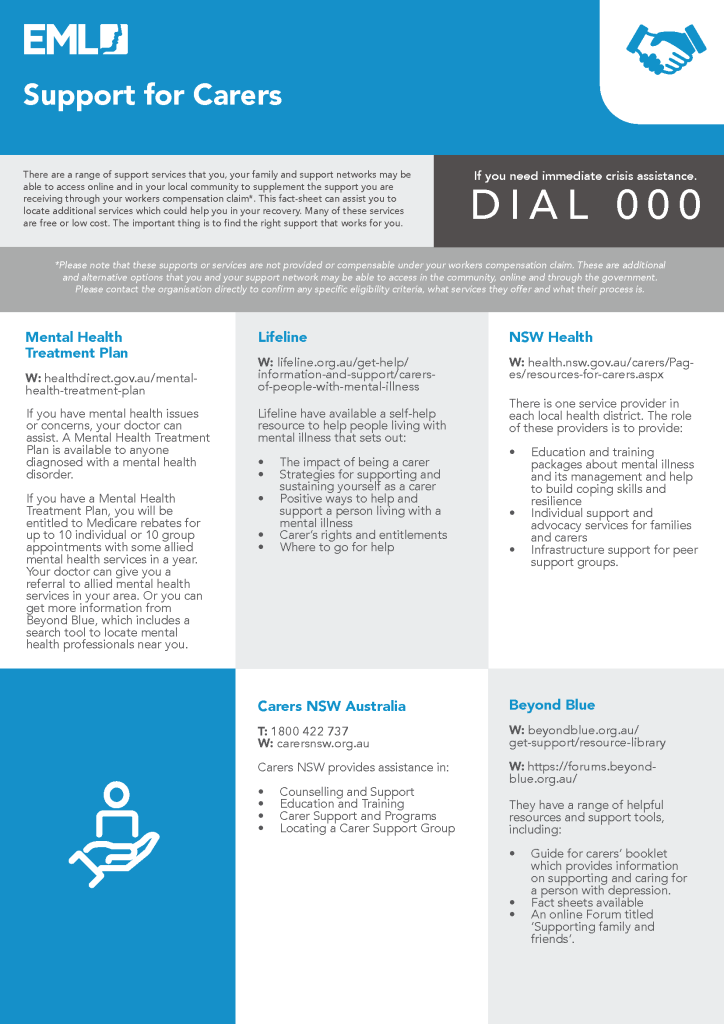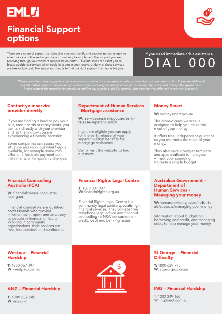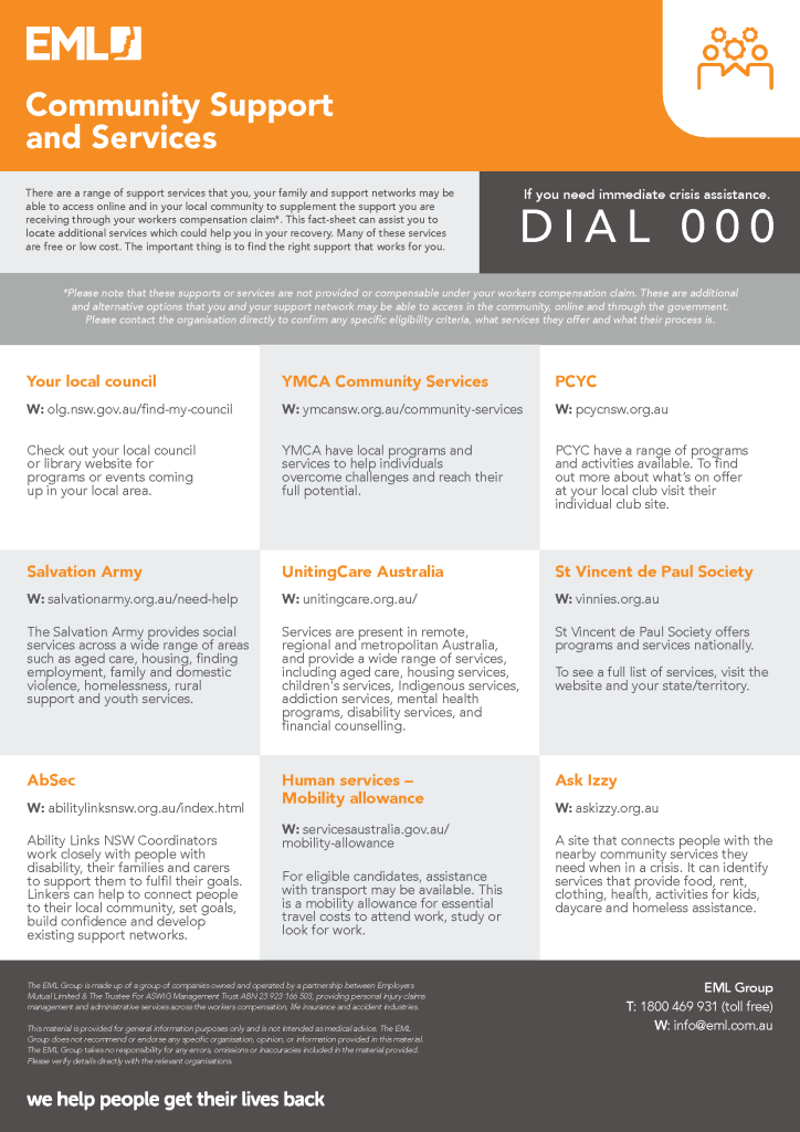 *Please note that these supports or services are not provided or compensable under your workers compensation claim. These are additional and alternative options that you and your support network may be able to access in the community, online and through the government. Please contact the organisation directly to confirm any specific eligibility criteria, what services they offer and what their process is.